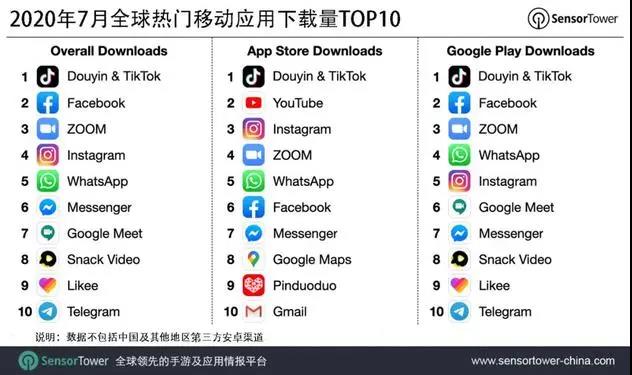 Sensor Tower商店情報數據顯示,20207月,抖音及海外版TikTok以超過6520萬次下載量,繼續位列*移動應用(非游戲)下載榜*。