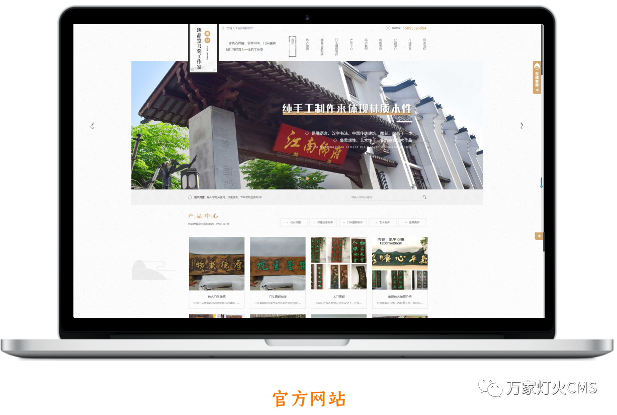根據琢品堂的古風文化特色,萬家燈火制定了適合的網站,并將公司核心產品:仿古牌匾、牌匾創意刻字、門頭匾額制作重點突出。萬家燈火CMS系統制作完成后,宋總對效果非常滿意,便馬不停蹄安排上線。