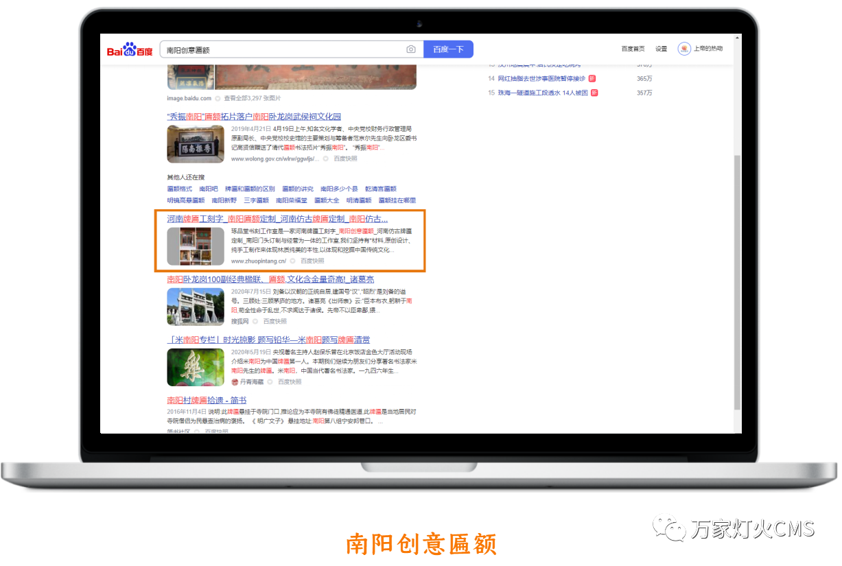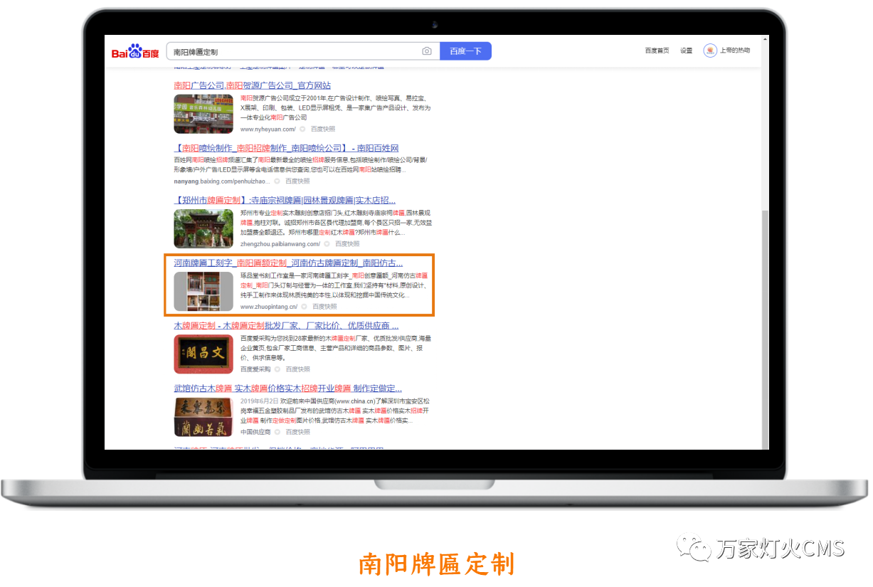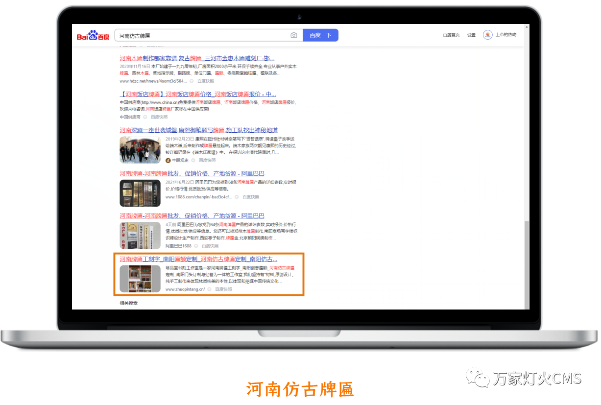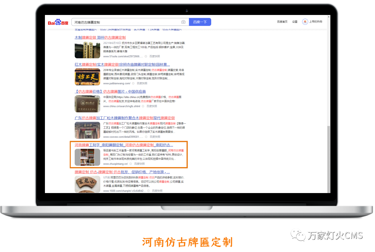 出乎宋總意料之外的是:網站上線兩周,就被百度收錄,且關鍵詞:河南仿古牌匾、河南仿古牌匾定制、河南門頭牌匾刻字、南陽創意匾額、南陽牌匾定制等關鍵詞均在百度首頁排名。